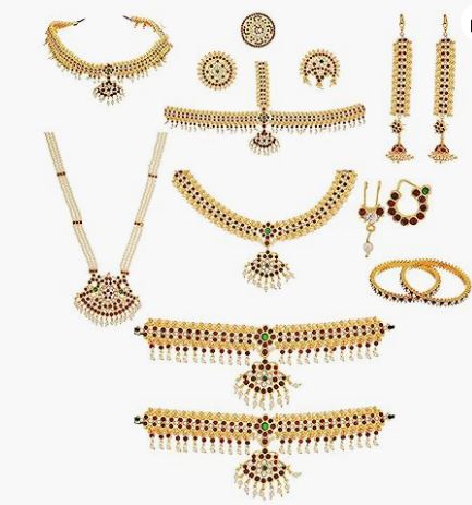 Gold Plating Green and Red Kemp Stones Gold Copper Complete Bharatanatyam Jewellery Set with All the 10 Separate Ornaments for Women